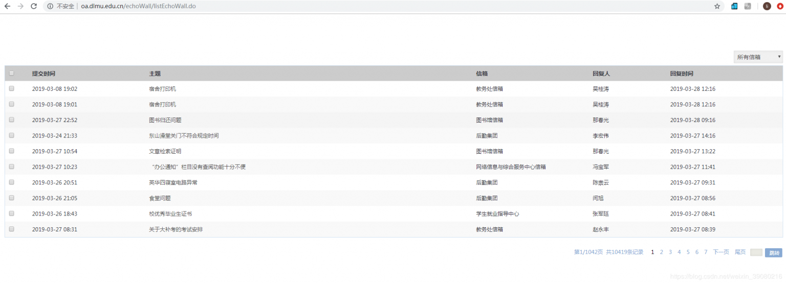 首先,我们打开信箱列表链接http://oa.dlmu.edu.cn/echoWall/listEchoWall.do如图所示:
